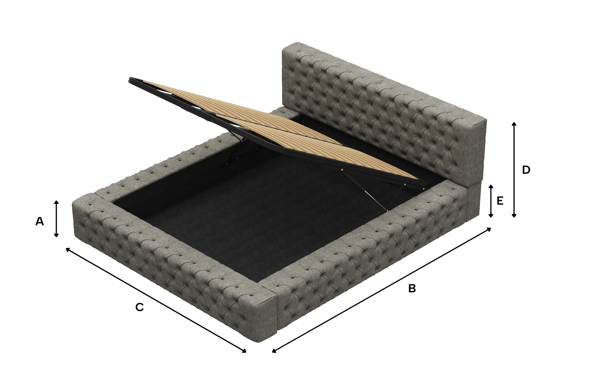 Underneath the luxurious exterior is the clever functionality of an ottoman gas lift frame. With a simple pull of the handle, the quiet pistons lift the entire mattress deck to reveal a large storage bed compartment perfect for linens, seasonal clothes or spare bedding. This lift-storage bed combines the solidity of a fabric wrapped platform bed with the space-saving benefits of hidden under-bed storage, so the Amalfi Ambassador is as practical as it is beautiful – a true showstopper for any room.