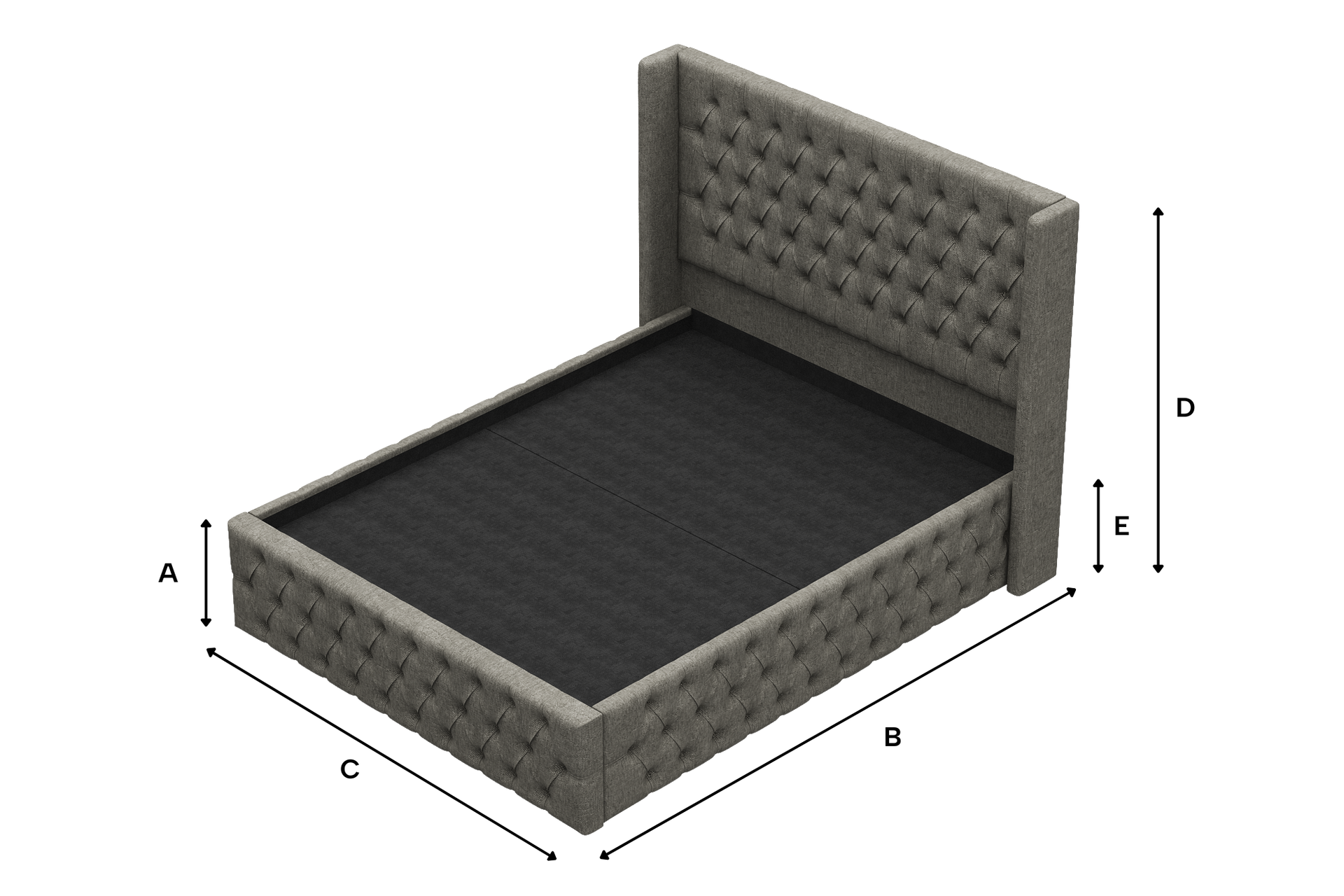 - Chesterfield button-depth diamond tufting on headboard and base